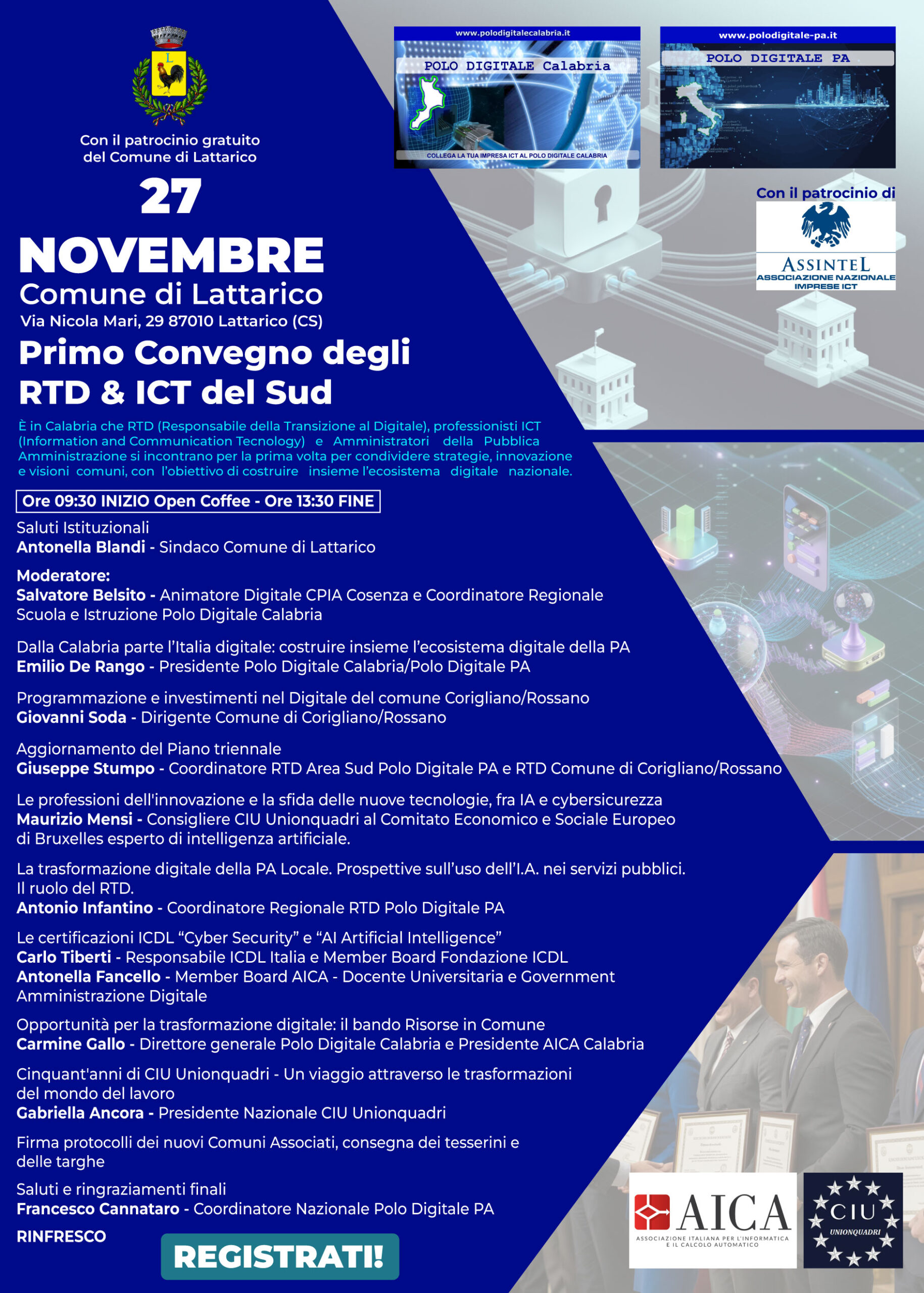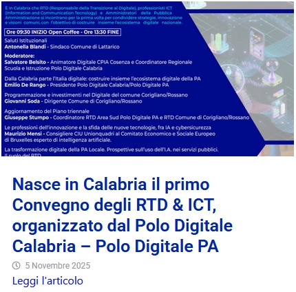 È in Calabria che RTD, professionisti ICT e Amministratori della Pubblica Amministrazione si incontrano per la prima volta per condividere strategie, innovazione e visioni comuni, con l’obiettivo di costruire insieme l’ecosistema digitale nazionale.